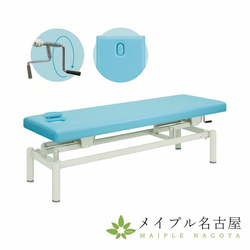 手動旋回昇降式で高さを調節できるクランク式ハンドル操作の施術台。